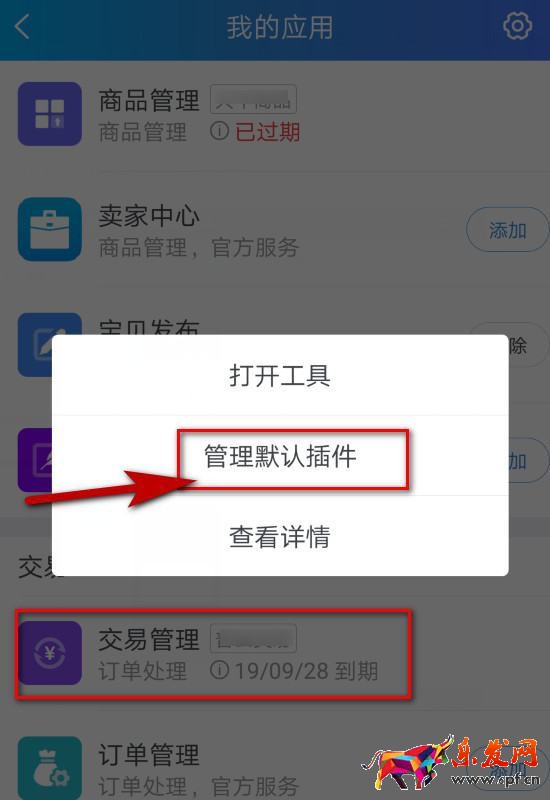2、然后,在我的應(yīng)用的界面點擊交易管理,在彈出的窗口中點擊管理默認插件。