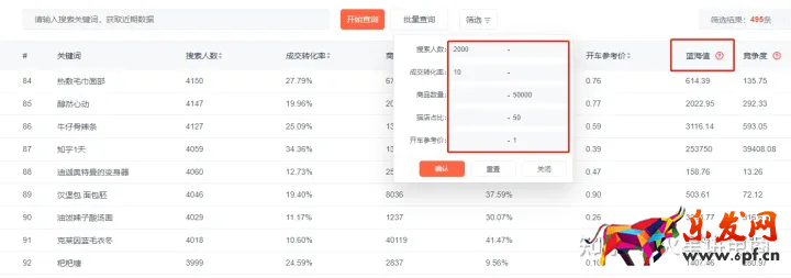 第四步:按照這樣的方式篩選后,就會得到一個(gè)符合條件的關(guān)鍵詞列表,接下來我們只需要去進(jìn)一步篩選關(guān)鍵詞,按照藍(lán)海值排序,藍(lán)海值越高代表競爭越小,然后找出里邊能夠做為產(chǎn)品的詞就行。