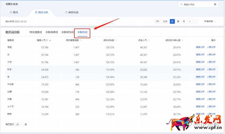 接著,我們點(diǎn)開“相關(guān)分析”,看看“毛呢大衣女”中,哪些關(guān)鍵詞更有“市場(chǎng)需求力”。
