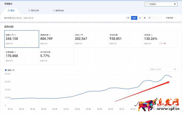 一個(gè)“搜索人氣”51843、一個(gè)248158.從“市場(chǎng)需求”而言,“羽絨服女”更具商業(yè)價(jià)值。