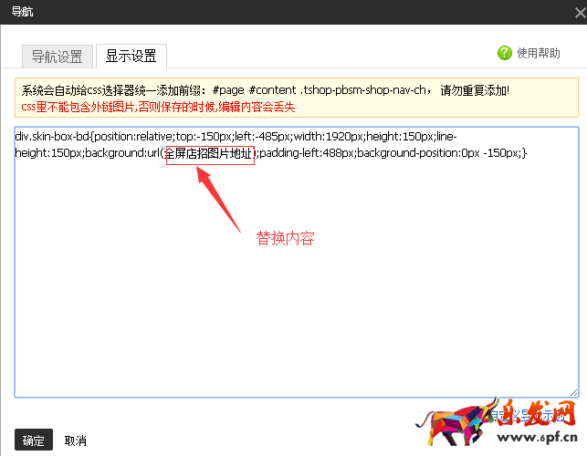 復(fù)制圖片以后將上面的導(dǎo)航CSS代碼裝到導(dǎo)航CSS編輯框里,然后將上面復(fù)制的圖片地址替換掉“全屏店招圖片地址”文字,發(fā)布即可看到效果。