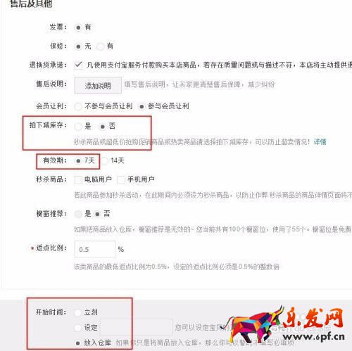 7 選擇付款減庫存(避免超賣,尤其是天貓店),有效期為7天,返點(diǎn)比例根據(jù)自身情況設(shè)置,最少0.5% (只有天貓店,集市店沒有這一項(xiàng))有根據(jù)具體請款選擇是立即上架還是約定時(shí)間上架,還是放入倉庫。