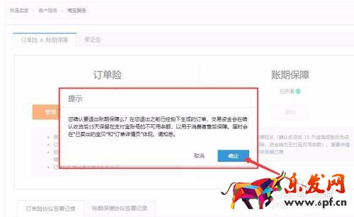 5 5、收到賬期保障【退出提示】,在閱讀提示后,點(diǎn)擊【確定】。