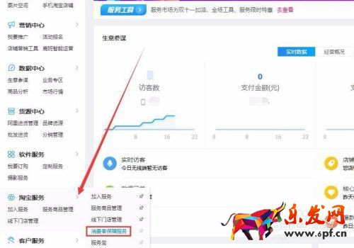 2 2、進(jìn)入千牛賣家工作臺(tái)主頁(yè),下拉頁(yè)面找到【淘寶服務(wù)】,點(diǎn)擊進(jìn)入【消費(fèi)者保障服務(wù)】。如圖所示: