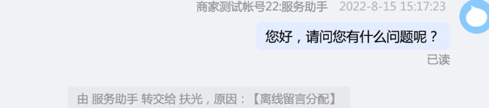 當(dāng)自動(dòng)分配給客服時(shí),千牛的接待消息中會(huì)展示轉(zhuǎn)交的系統(tǒng)消息,并注明原因?yàn)椤鸽x線留言分配」。