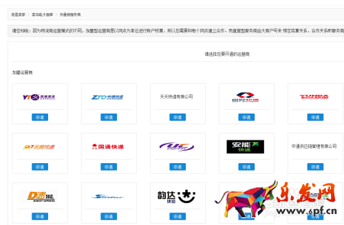 2 進(jìn)去之后,會(huì)看到很多的快遞公司,找到需要合作的快遞商,點(diǎn)擊申請(qǐng)。