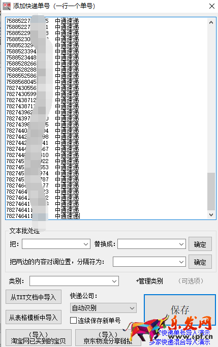 開始導(dǎo)入快遞單號,多個單號的話,可以一行導(dǎo)入一個,導(dǎo)入后,單擊保存