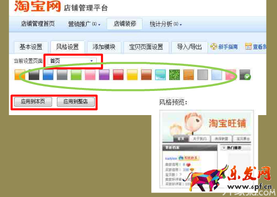 選擇喜歡的風(fēng)格,普通的店鋪風(fēng)格選擇比較少,出錢購買的淘寶旺鋪風(fēng)格就更豐富了,選好顏色后點擊應(yīng)用到本店或應(yīng)用到整店,相應(yīng)頁面的色調(diào)就會改變。