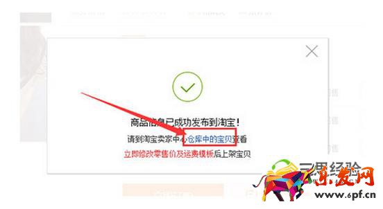 上傳成功后出現(xiàn)如圖提示,點(diǎn)擊【倉(cāng)庫(kù)中的寶貝】進(jìn)入淘寶倉(cāng)庫(kù)。