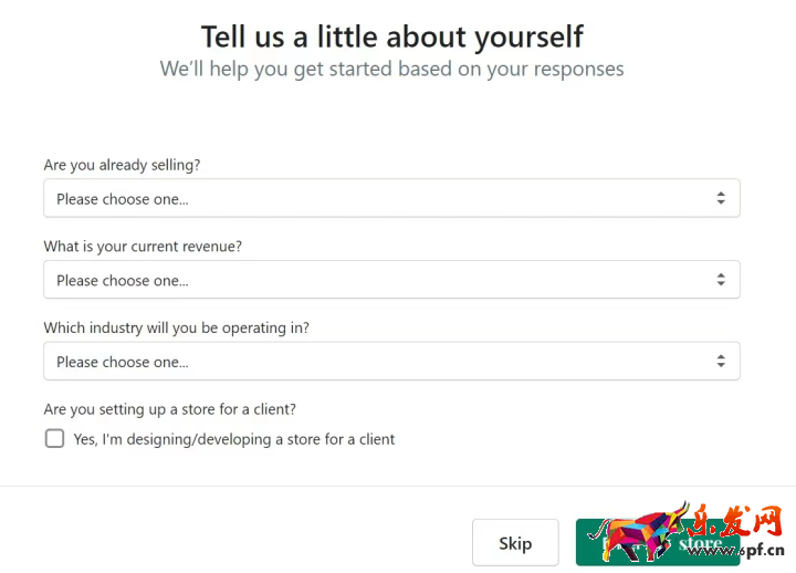 4、店鋪創(chuàng)建成功之后,Shopify會(huì)做幾項(xiàng)簡(jiǎn)單的調(diào)查,問(wèn)你是否開(kāi)過(guò)店,你現(xiàn)在的營(yíng)業(yè)額s多少等等,你按照你的實(shí)際情況填就好了。問(wèn)卷調(diào)查如實(shí)填寫(xiě)有助于Shopify給你推送一些相關(guān)的學(xué)習(xí)資料。