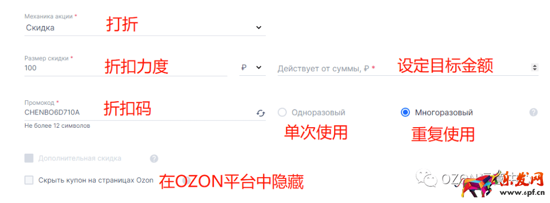 下面可以系統(tǒng)自動(dòng)生成折扣碼,或者手動(dòng)輸入(由字母和數(shù)字組成,不能超過12個(gè)字符)。右側(cè)可以選擇折扣碼是單次使用還是多次使用。如果你不想在OZON的頁面中展示你的折扣碼,我們可以選擇隱藏。