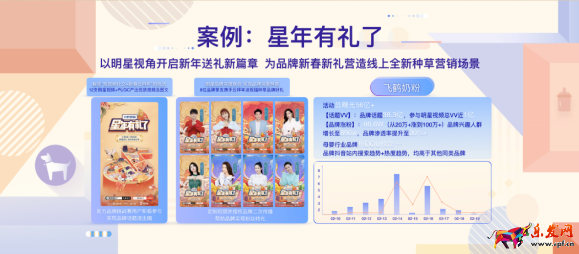 以飛鶴為例,在今年春節(jié)前夕,飛鶴在抖音上集結(jié)20+明星進(jìn)行話題打call和好物種草,好玩有趣的互動(dòng)形式吸引15萬+用戶參與創(chuàng)作投稿。
