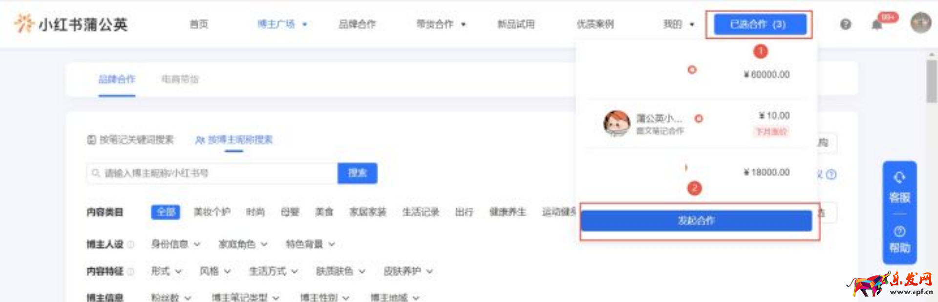 2)【已選合作】下單:點擊【已選合作】-【發(fā)起合作】,選擇已在列表中的博主確認結算。