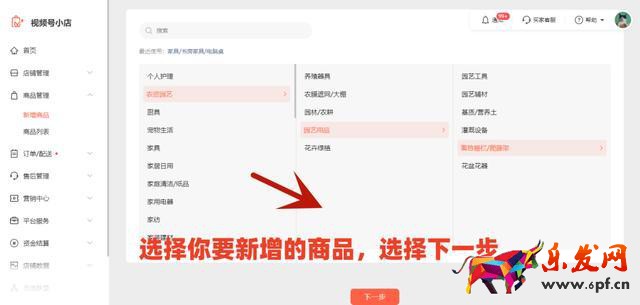 2、選擇你要發(fā)布的商品類目,選擇下一步。