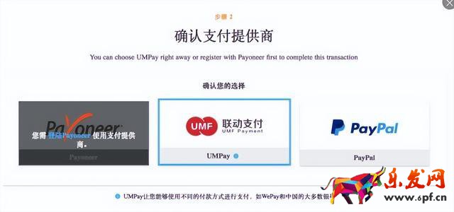 點擊“下一頁”進入“確認支付提供商”頁面。 目前有三個支付提供商可供您選擇:Payoneer、 UMPay聯(lián)動支付、Paypal。 選擇一個支付提供商(以UMPay為例),確認好支付提供商后,點擊“繼續(xù)”。