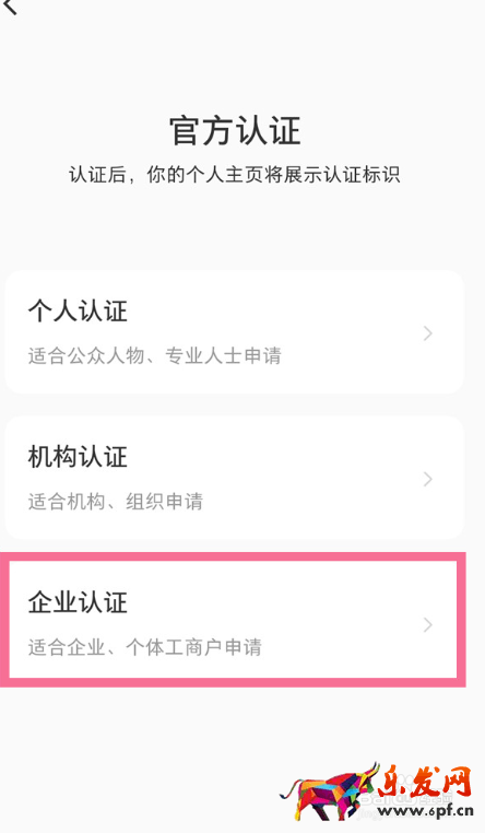 2 然后點(diǎn)擊【官方認(rèn)證】選項(xiàng),接著點(diǎn)擊【企業(yè)認(rèn)證】。