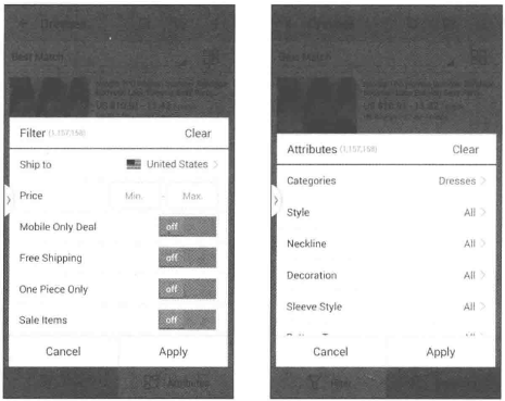 如下圖所示,左下方的“Filter” 篩選項(xiàng)可以篩選是否包郵,是否設(shè)置手機(jī)專享價(jià)等買家比較關(guān)注的優(yōu)惠方式。而右下方的“Attributes” 能篩選出該類目下的符合某些特征的商品。