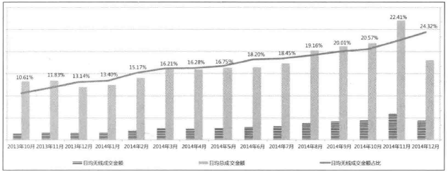 短的柱形圖是無(wú)線(xiàn)成交金額,長(zhǎng)的柱形圖是總成交金額,趨勢(shì)線(xiàn)是無(wú)線(xiàn)成交金額占總成交金額的比例(無(wú)線(xiàn)成交金額÷總成交金額)。