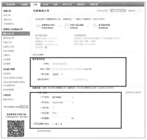 所示。國內(nèi)物流信息指賣家將包裹寄送至收貨地址所使用的物流信息,符合攬收范圍及免費攬收標準的包裹允許申請上門攬收,僅需補充攬收信息,包括中文姓名、電話、郵編、地址。包裹信息指發(fā)貨產(chǎn)品的報關(guān)信息,包括產(chǎn)品中文名、英文名、產(chǎn)品件數(shù)、申報金額、申報重量及是否含鋰電池。
