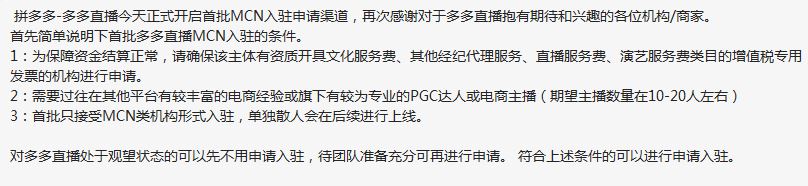 目前拼多多MCN機(jī)構(gòu)只有MCN機(jī)構(gòu)類企業(yè)才能申請入駐。