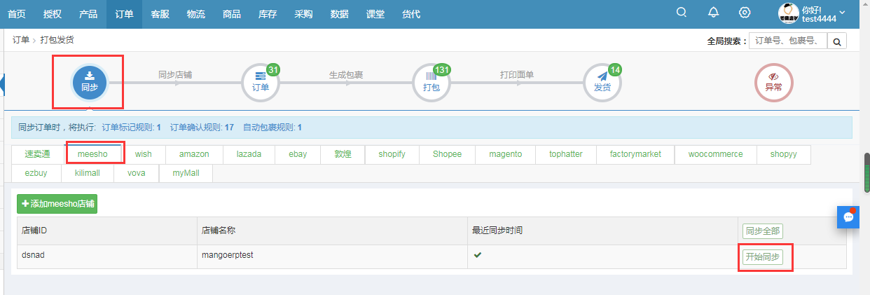 第三步:【訂單】--【打包發(fā)貨】將訂單同步到芒果,如下圖