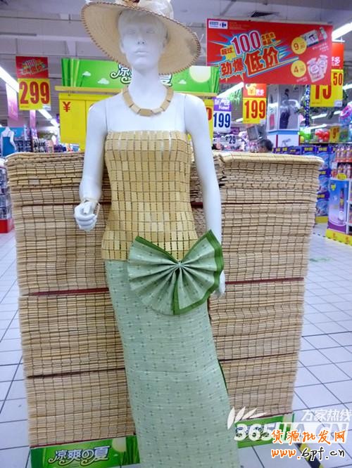 大潤發(fā)超市用涼拖做材料,一層層組成了一只美麗的“大蝴蝶”,并按照拖鞋紅、藍和粉色等顏色的不同堆出了層次,非常有創(chuàng)意,不禁讓人感嘆:超市的工作人員也太有才了吧!而大潤發(fā)的涼席穿在模特身上,也萌翻了不少市民,別出心裁的“清涼裝”也給夏天帶來了清爽的感覺。